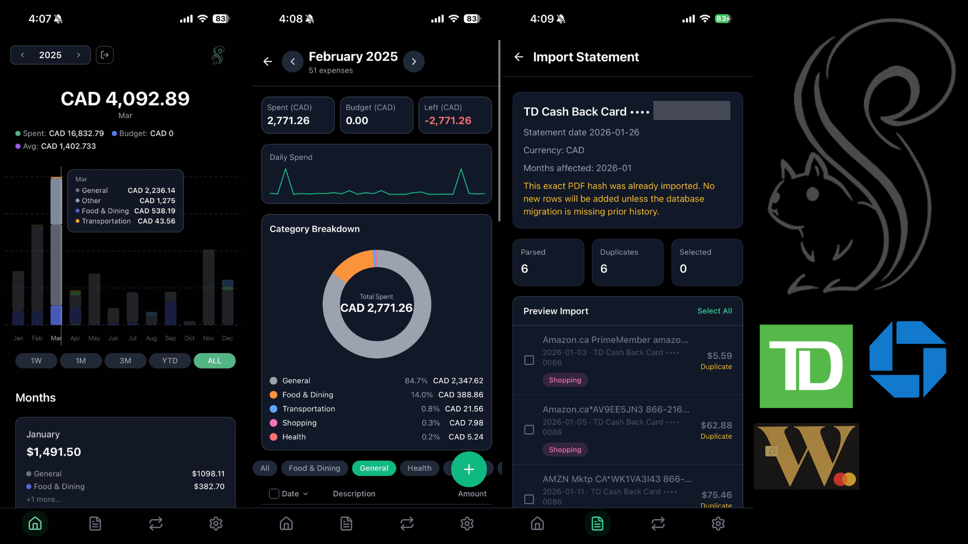 monthly budgets, track spending across categories, manage recurring expenses, and view a